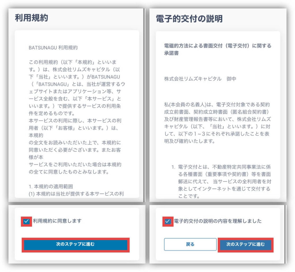 次に利用規約を確認して、同意のチェックを入れてから「次のステップに進む」をタップ。