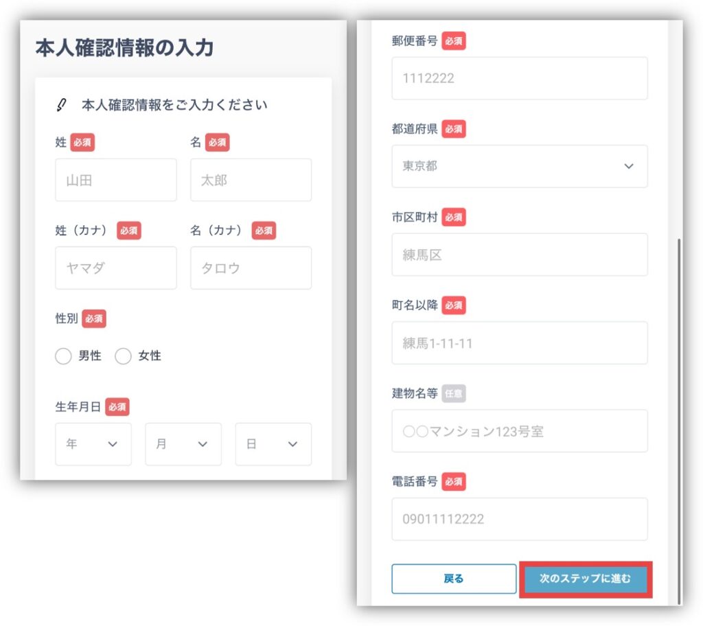 氏名や性別、住所などの基本情報を入力して「次のステップに進む」をタップ。