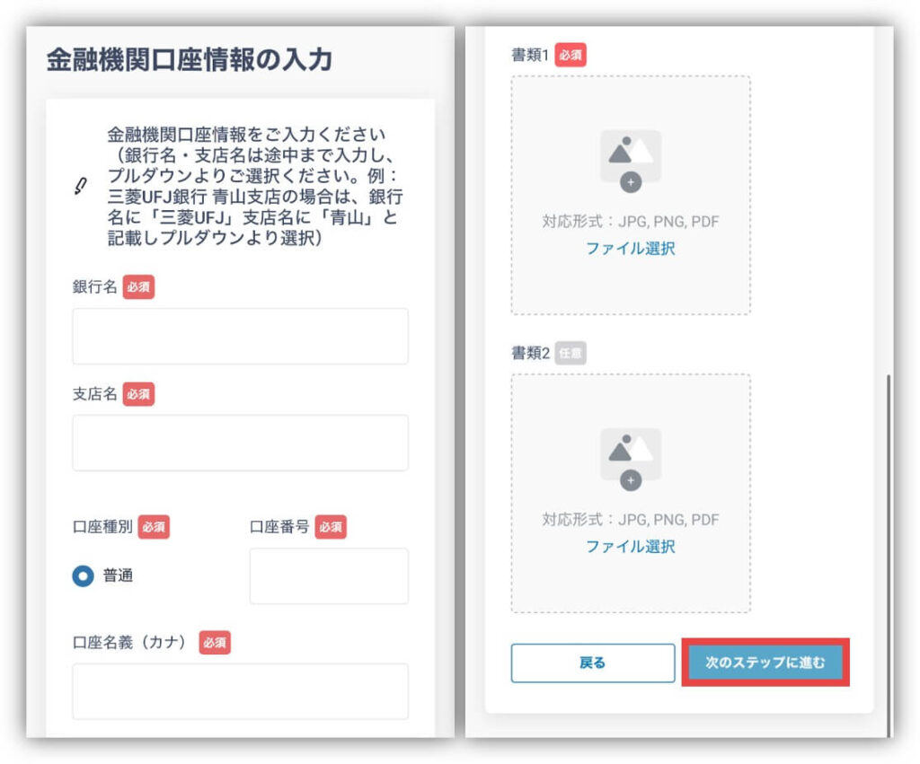 銀行名や支店名などを入力し、口座情報がわかる書類をアップロードして「次のステップに進む」をタップしてね👍