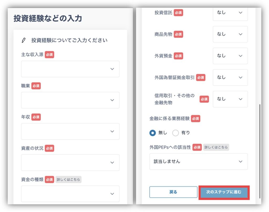 投資経験などの入力もしたら「次のステップに進む」をタップ。