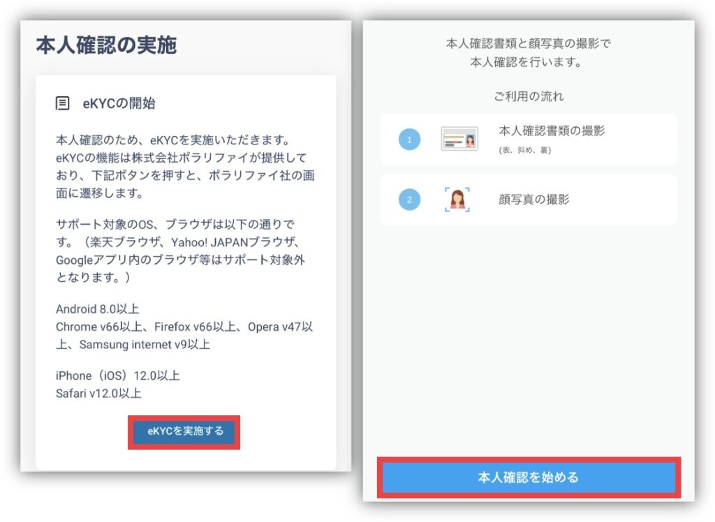 「eKYCを実施する」→「本人確認を始める」の順で進んでね👍
