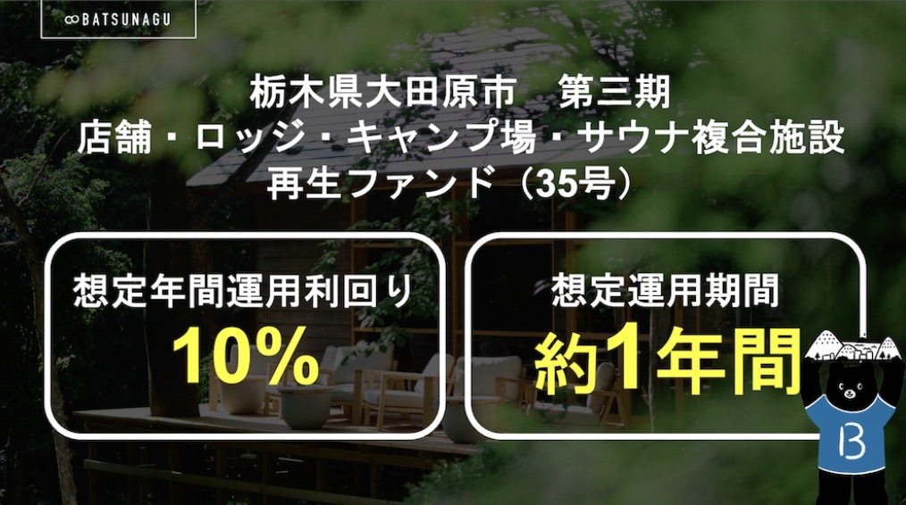 そんな株式会社リムズキャピタルが提供しているBATSUNAGUは、地域の資産を活かして町の活性化へとつなげるファンドを多く募集している😌