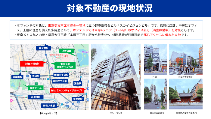 今回は、東京都文京区本郷の一等地にある都市型複合ビル「スカイビジョンビル」の中層フロア(3~6階)のオフィス部分が投資対象だよ👍
