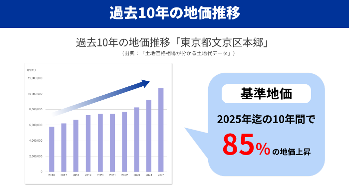 またビルの建つ「東京都文京区本郷」は、過去10年間で地価が85%(2倍近く)も上昇しているエリア