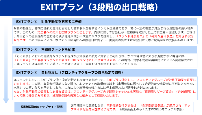 そして3つ目の出口戦略は、もし①と②の出口戦略がうまくいかなかった場合に、運営会社のフロンティアグループがこの物件を買い取ること。