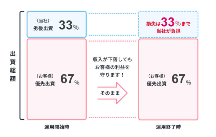 もし物件の運用期間中や売却時に損失が出ても、事業者の劣後出資額までの範囲なら、元本割れはしないよ。