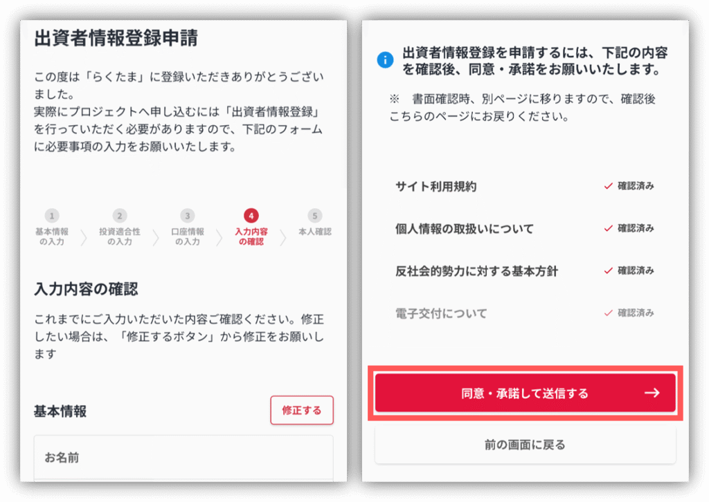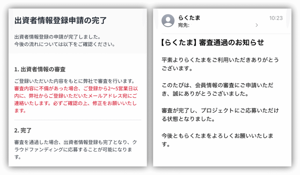 すべての撮影が終わると、「出資者情報登録申請の完了」が表示されるから、審査が終わるまで少し待ってね🥰