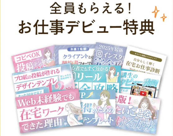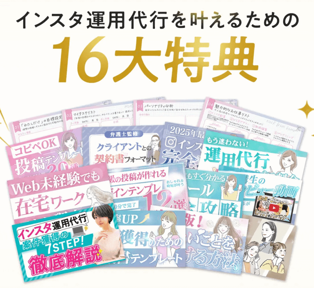 SNSを仕事にするために役立つ投稿テンプレートや、案件獲得の攻略法など、16種類の特典コンテンツがもらえます!