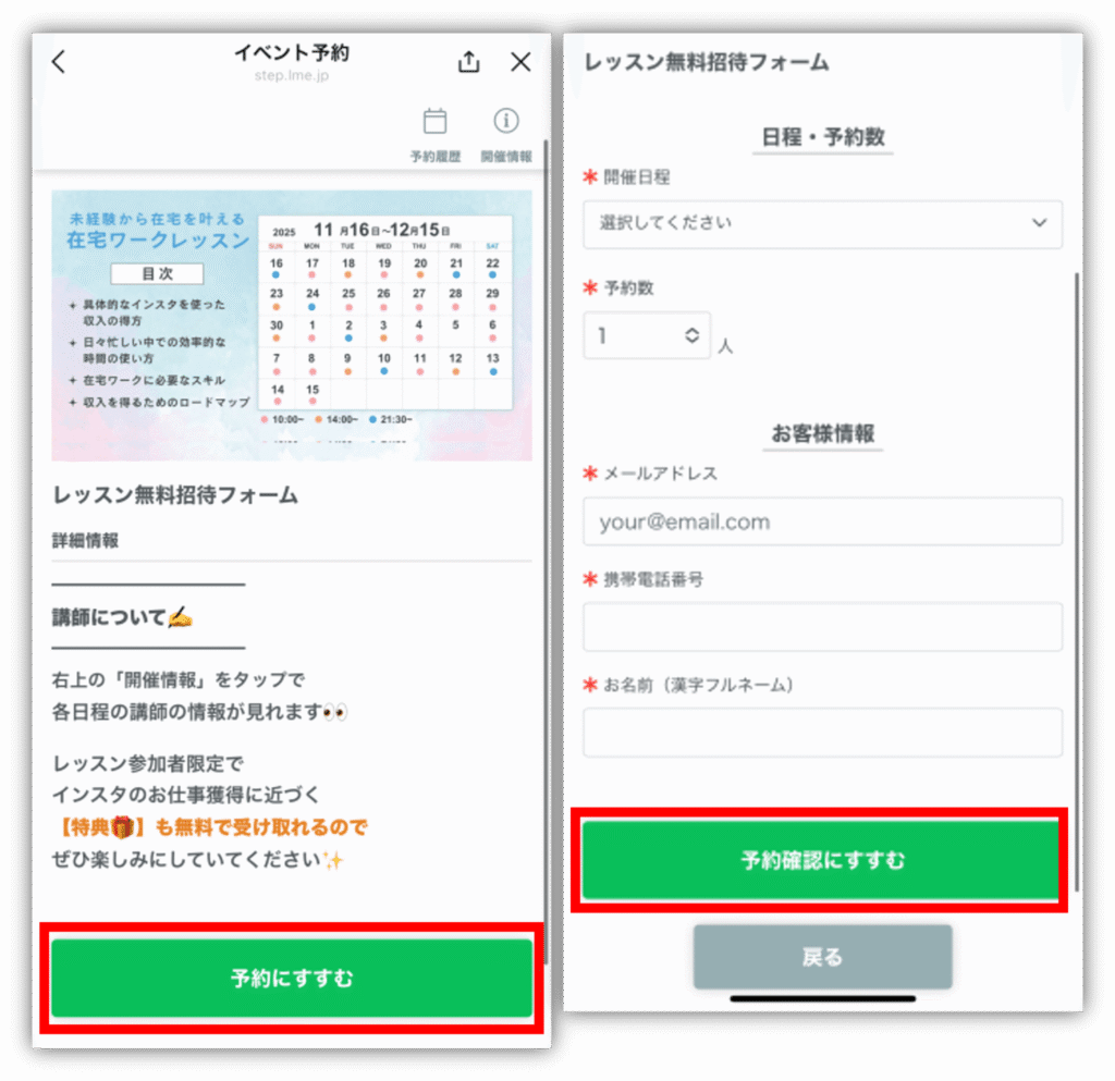 無料体験を受ける「開催日程」と「予約数」を選択して、メールアドレスと携帯電話番号、お名前を入力したら「予約確認にすすむ」をタップ!