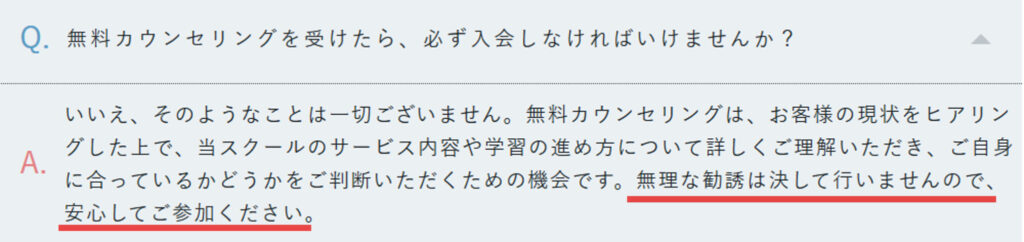 公式サイトのよくある質問にも「無理な勧誘は決して行いません」とハッキリと明記されているよ👍