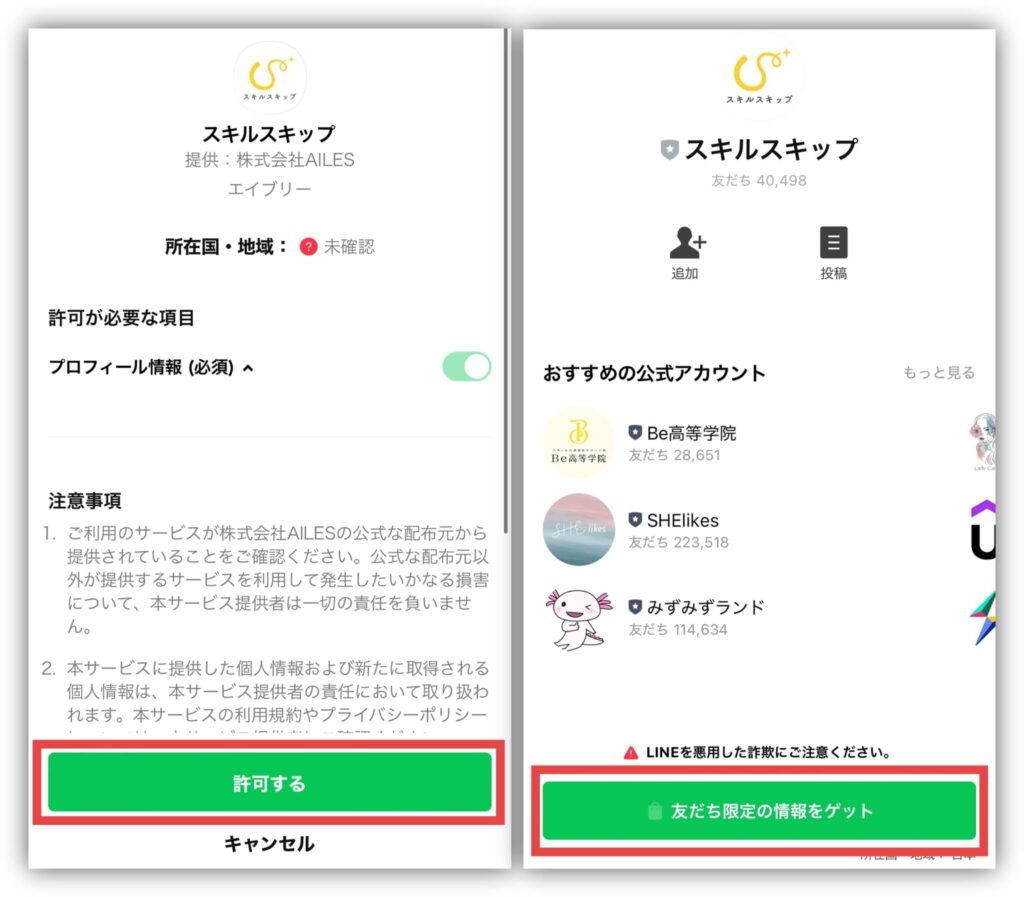 スキルスキップの公式LINEが表示されるから「許可する」→「友だち限定の情報をゲット」の順にタップしてね。