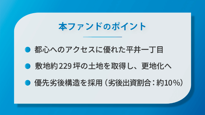 このファンドは、東京都江戸川区平井1丁目にある計990.36㎡の土地が投資対象だよ!
