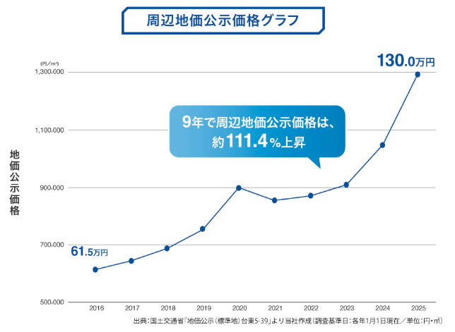 実際に周辺の地価は、9年間で約111%も上昇しているよ💓