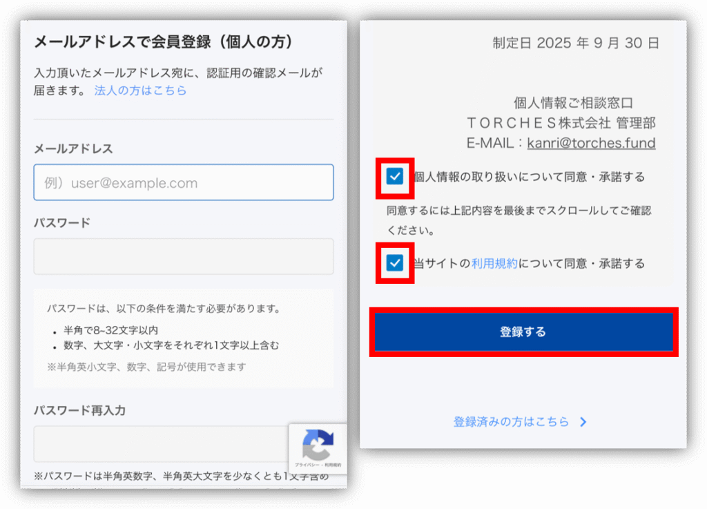 メールアドレスとパスワードを入力して、利用規約等のチェックを入れたら「登録する」をタップ👍