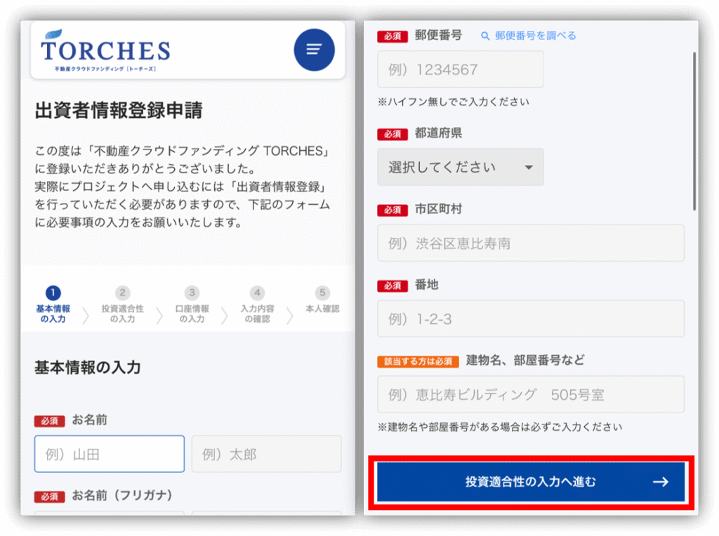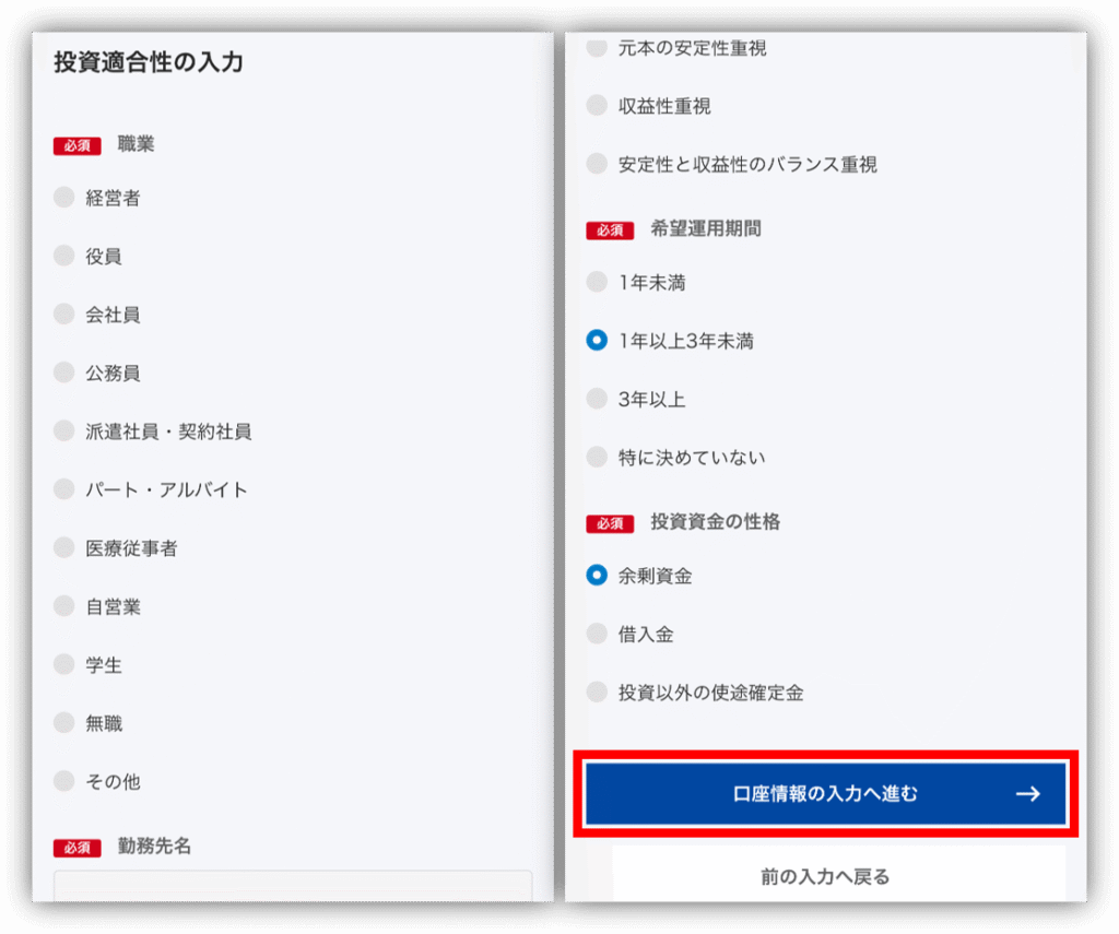 お名前から順に入力していき、入力が終わったら「投資適合性の入力へ進む」をタップ👍