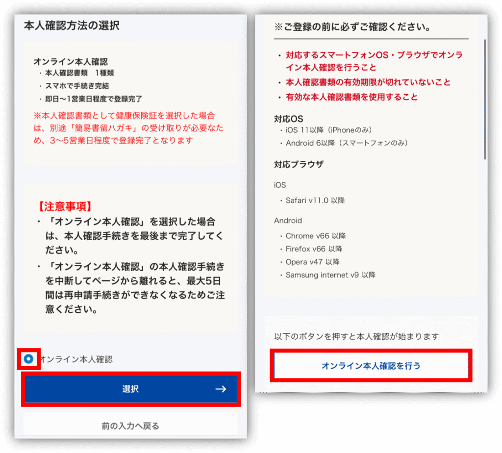 本人確認方法は「オンライン本人確認」を選んだら、「選択」をタップ。